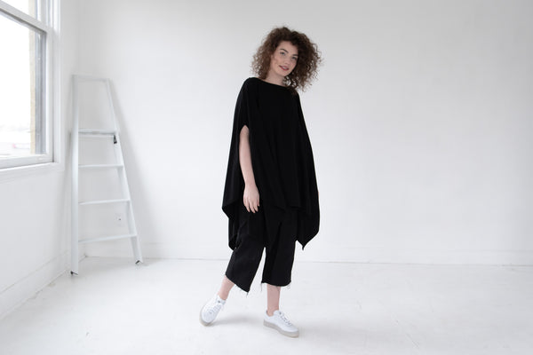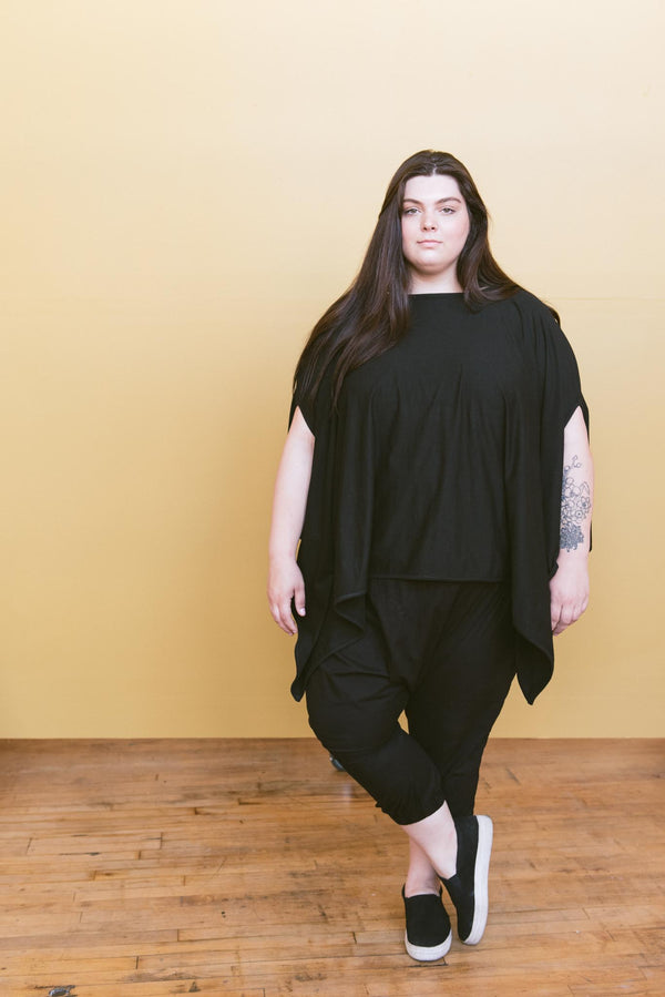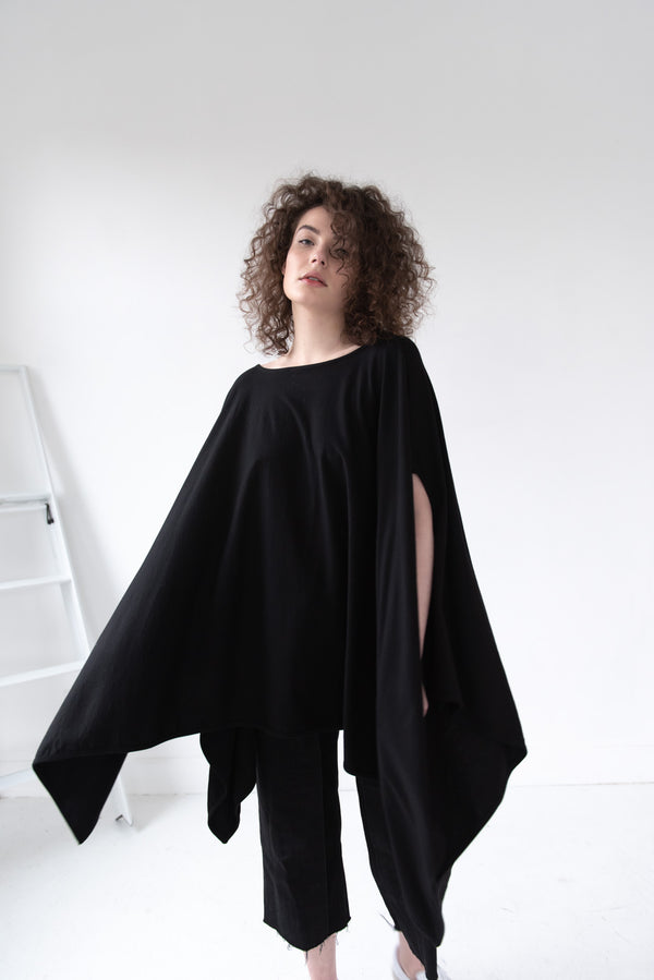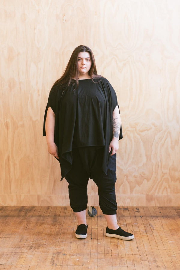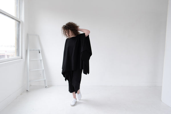 One Piece Design. Short Sleeves. Black.  100% HEAVY JERSEY COTTON. Irregular Design, longer on the sides. Free Size. Fits S/M/L/XL. Gender Neutral. Please note that each piece is ethically hand made.