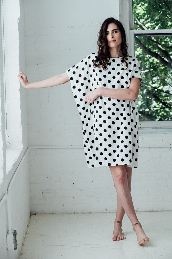 85% Cotton and 15% Flax. Creamy white with black block printed polka dots. Short Sleeves. Loose and comfortable style. One size. Please note that each piece is ethically hand made. The polka dots are hand printed with the traditional block...